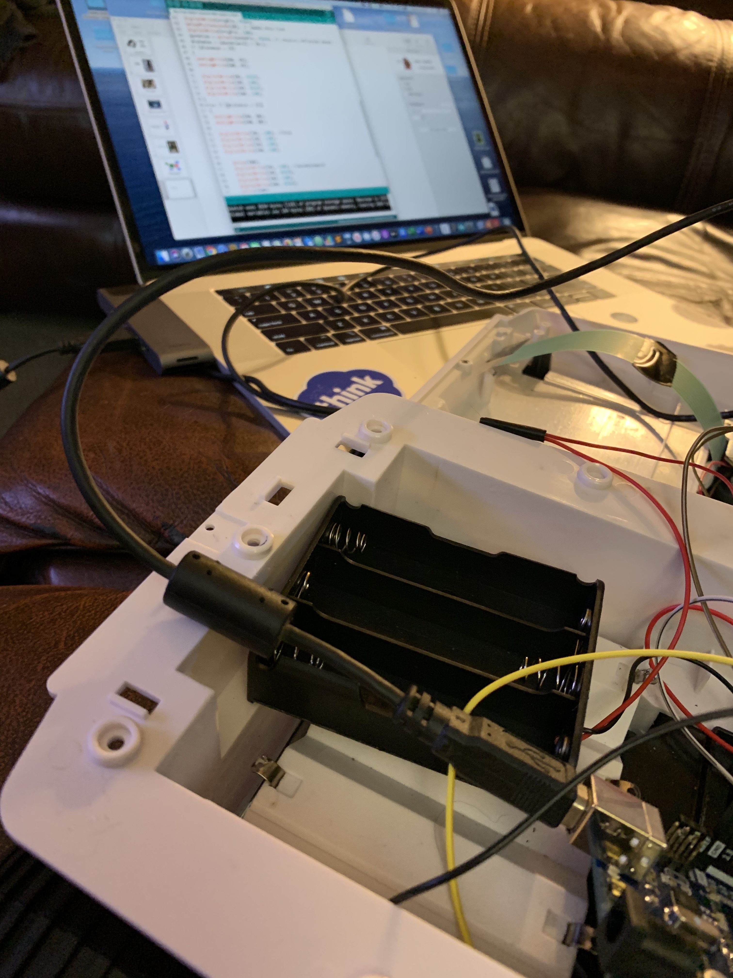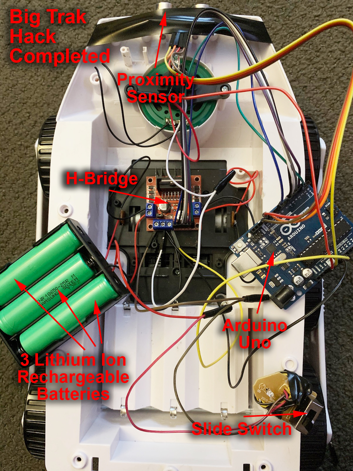Now I replaced the PCB with the Arduino Board and added a Proximity Sensor in the front of the Big Trak. Also I replaced the D battery powered source with a much more efficient rechargeable set of 3 lithium ion batteries.